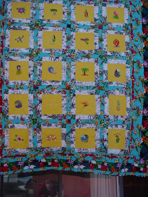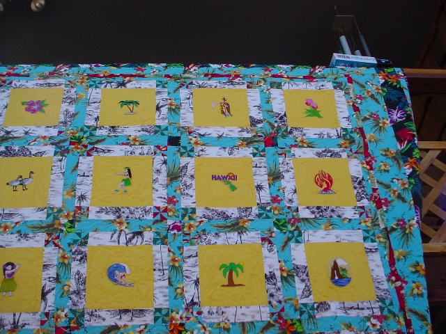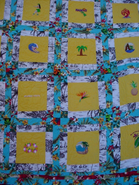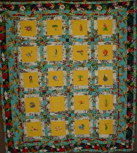 Quilt made for the USA West Square Dance Convention held in 2005 in Honolulu, Hawaii. It was great fun finding all of the emboirdery designs that showed the flavor of Hawaii. All the the material is from Hawaii except for the background of the embroidered squares. |