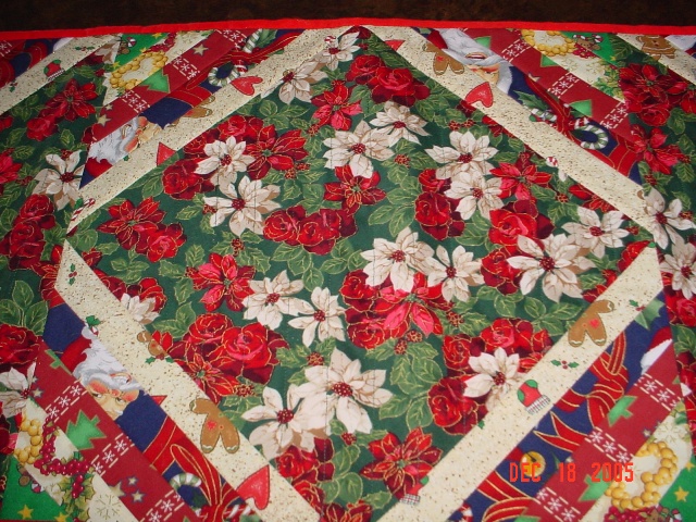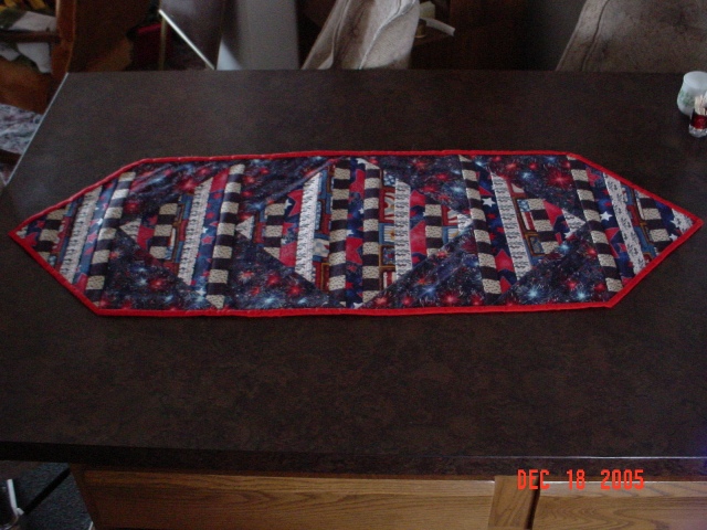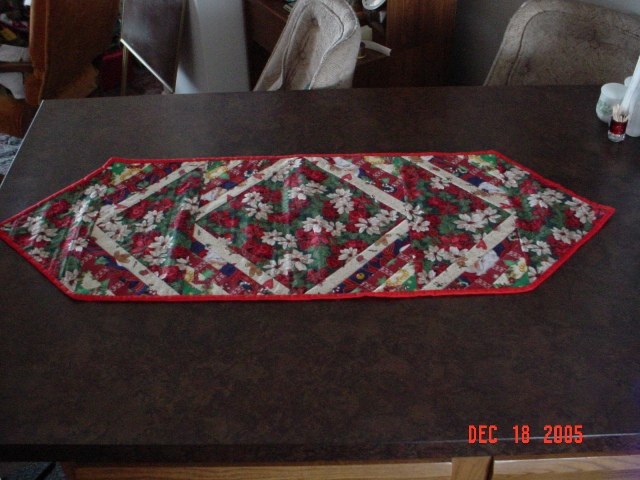 Reversible Table Runner pattern by The Quilt Company. It is pieced and quilted at the same time. Good pattern to use for 2 special occations. Given to Ann Root. |