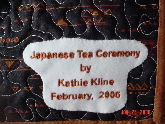Japanese Tea Wall hanging. Made for my daughter Barbara. This wall hanging was quite a challenge. It is a design from Embroidery Library that is 11.57 x 6.36 Since my embroidery machine at the time could only do a 4 x 4, it was a lesson by Flying Needle on how to devide the design into different sections. |