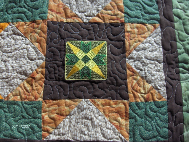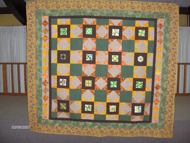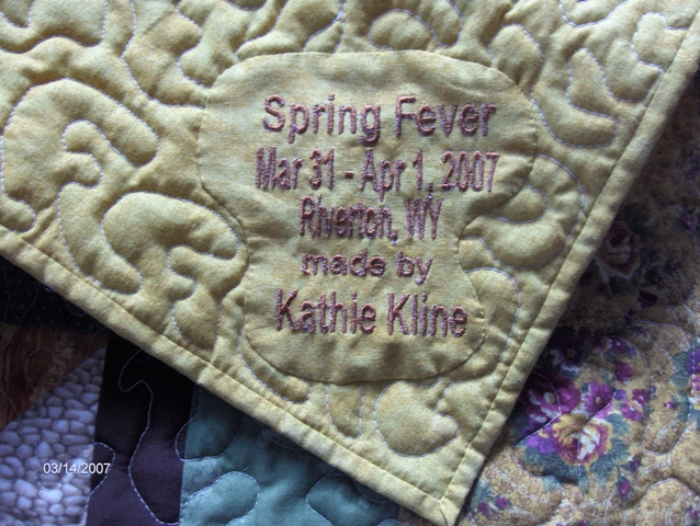Quilt made for the Spring Fling Square Dance, Riverton, Wyoming in 1997. All of the embroidery designs are of embroidery patterns. The quilt is stippled all over except through the embroidery designs. |