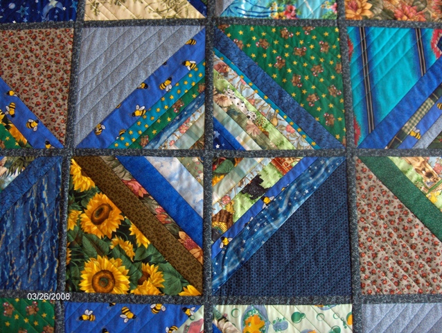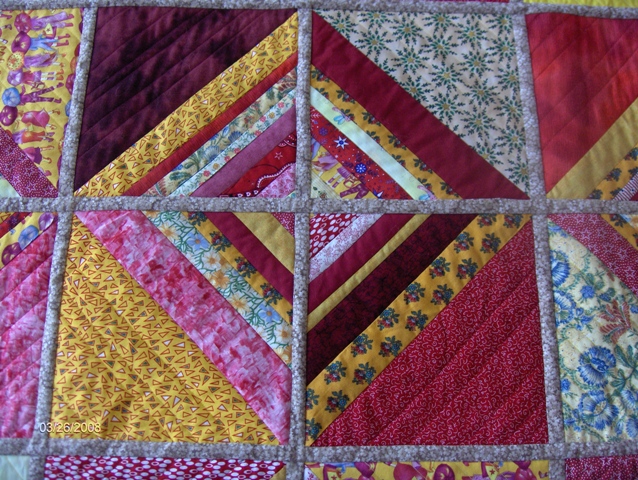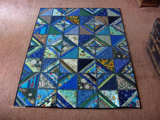 "Hot and Cold" quilt made for the Spring Fever Square Dance in Riverton, Woming. It is made from a technique that makes the quilt reversible, the quilting is done as you do the sewing. The pattern is from a book called "Two at a Time" by Sharon Pederson. |