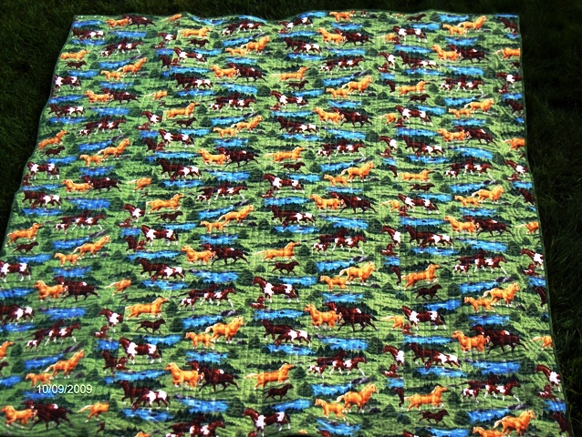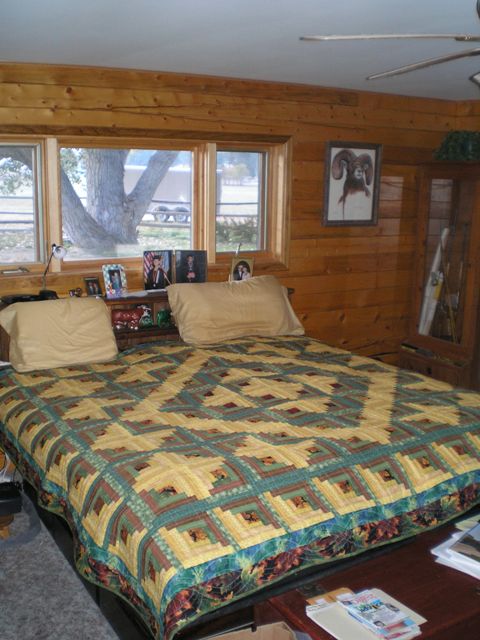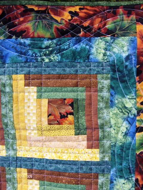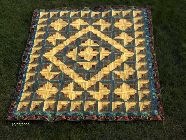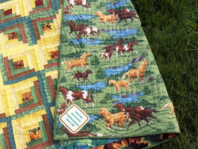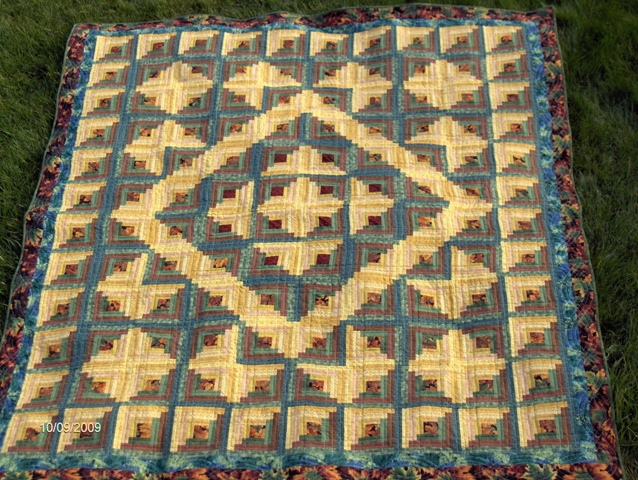 "Log Cabin" pattern made for Heather Christensen done in earth tones. The layout was done in Electric Quilt. It is a king size quilt. The backing is done in horse material as Heather is quite a horsewoman. |
