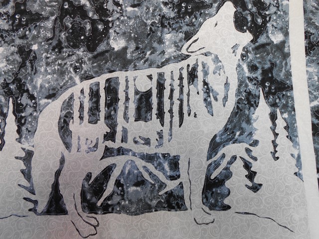 | This is an applique project that I bought sometime ago in Sheridan, Wyoming. The whole design is cut out as one piece of cloth and appliqued on the background. Then I machine echo quilted around the pieces and did some free motion quilting in the blank areas. | ||||