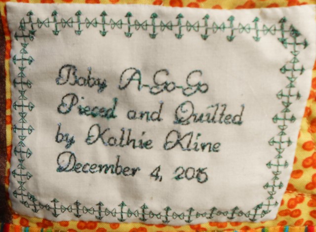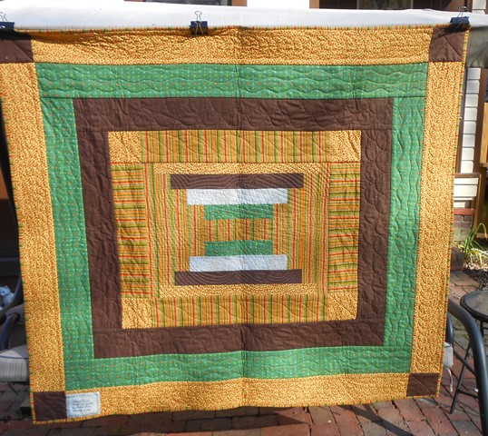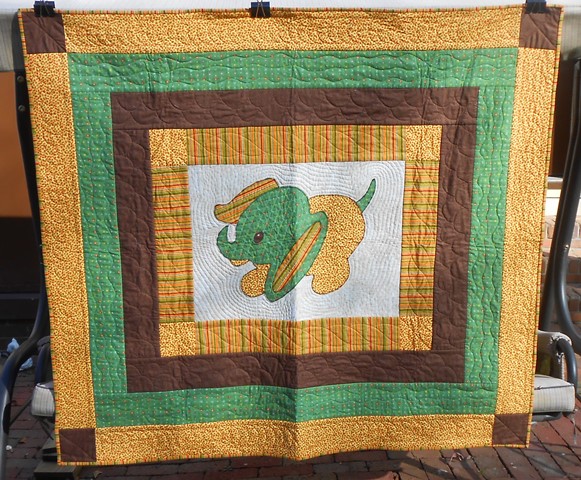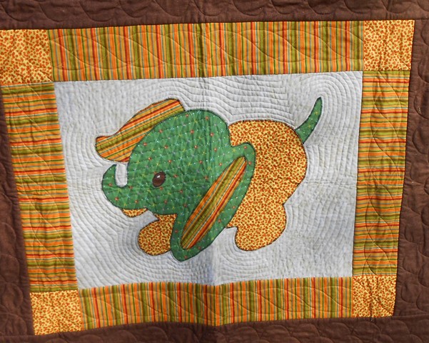 | Pattern from a book called ‘Quilt It As You Go’ by Annie’s Quilting. The center block is appliqued and then quilted before adding on the borders. Each border layer is added then quilted before doing the next border. The original pattern called for a plain piece of fabric on the back of the middle square but I decided to use pieces of the material from the project to make my own square. | ||||