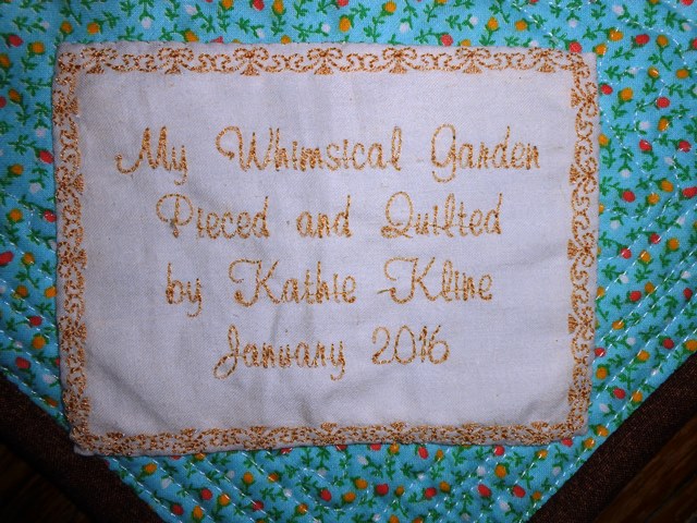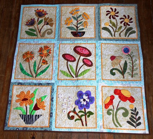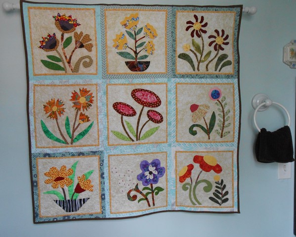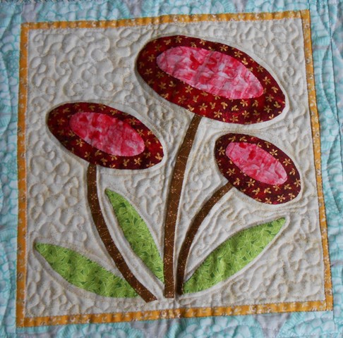 | From a design collection called “My Whimsical Quilt Garden” by Piece O’Cake Designs. This design has been done with needle turn applique. Fun pattern to make. | ||||