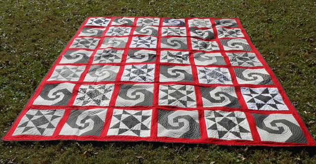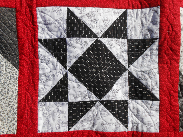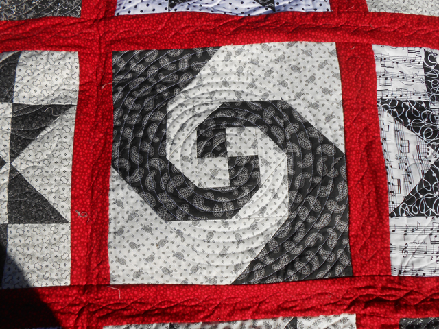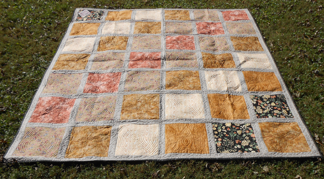 | All the pieces were cut with the accuquilt cutting machine. It makes the cutting more accurate and the pieces fit together perfectly. This quilt was done with the quilt as you go method of quilting. Given to Robin & Tim while visiting them in 2019. | ||||
