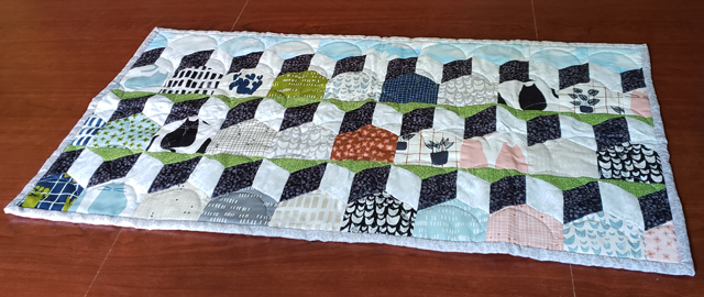 | A kit from Quilty Box English Paper Piecing. This was the Quilty box for July. It came with the material for the houses, 2 acrylic templates and the paper pieces. The finished size is 14 x 28 inches. | ||||