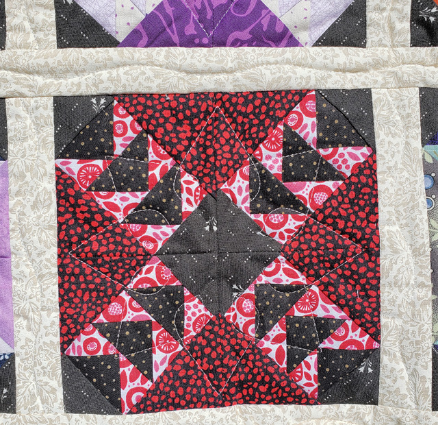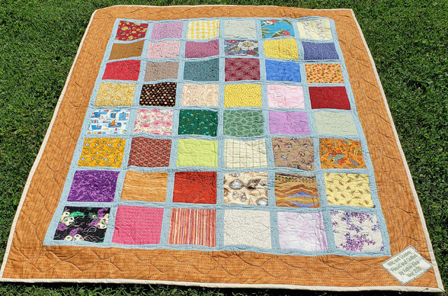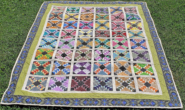 | This is an English Paper Piecing project. Each block is made of 4 sections. Each of the 4 sections has 52 individual pieces. The pattern appeared in the Quiltmaker magazine for the May/June, 2019, #151. I made this quilt while “The Stay at Home” order was in place for Covid 19. This quilt was given to our neighbeor, Kelsey, for her 2020 high school graduation. | ||||