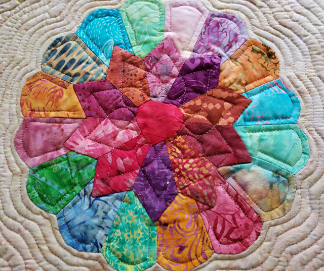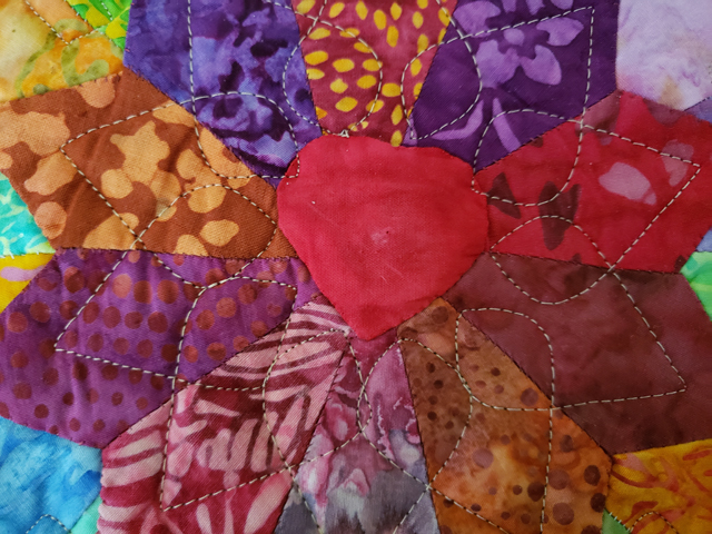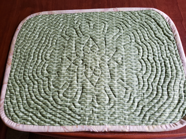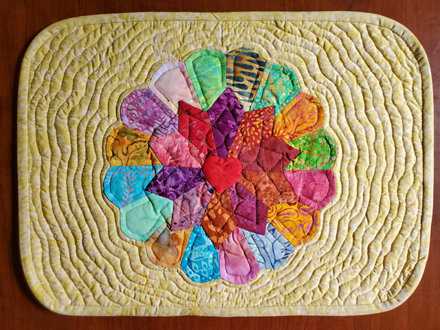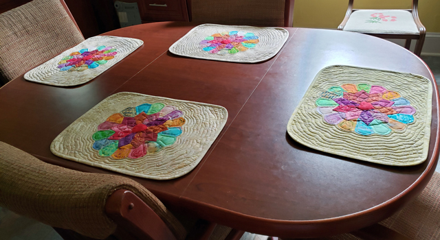 | These were made to match a table runner that was made with one of the Quilty Box English Paper Piecing Boxes. I made the table runner some time ago and finally got around to making place mats to match. | ||||