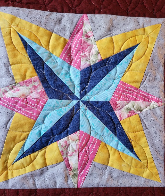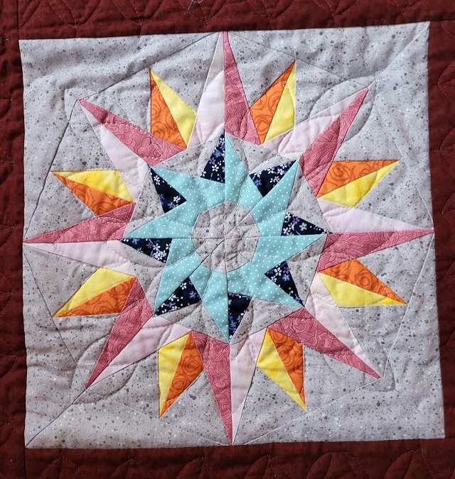 | A paper pieced project using the freezer paper method. With this method there is no sewing on the paper. You iron the freezer paper to the material and fold back along the line that you wish to sew. You sew along the paper and not through the paper. When you are finished the freezer paper just pull off with no mess. Very fun technique. | ||||