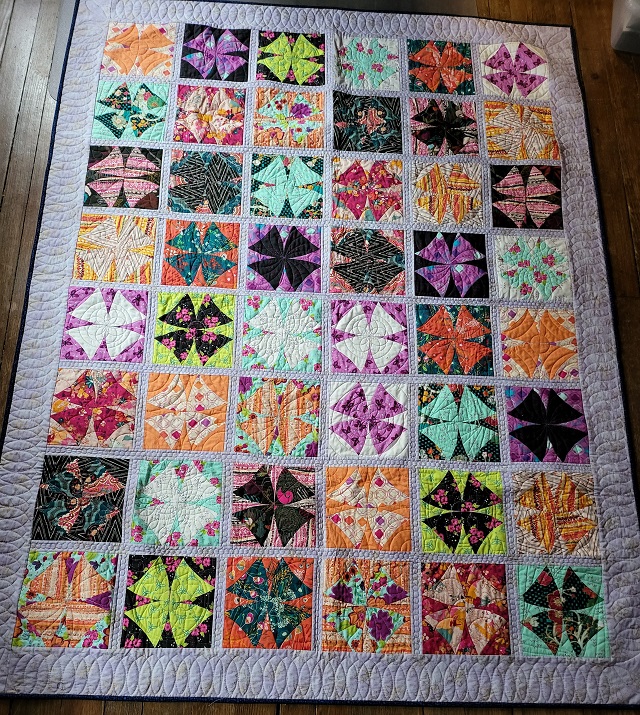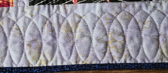 | The pieces were cut with the Accu Quilt cutting machine. The quilting was done with one of the Westalee quilting rulers. This was a project that Barbara and I each worked on making with our own fabric from our stashes. | ||||