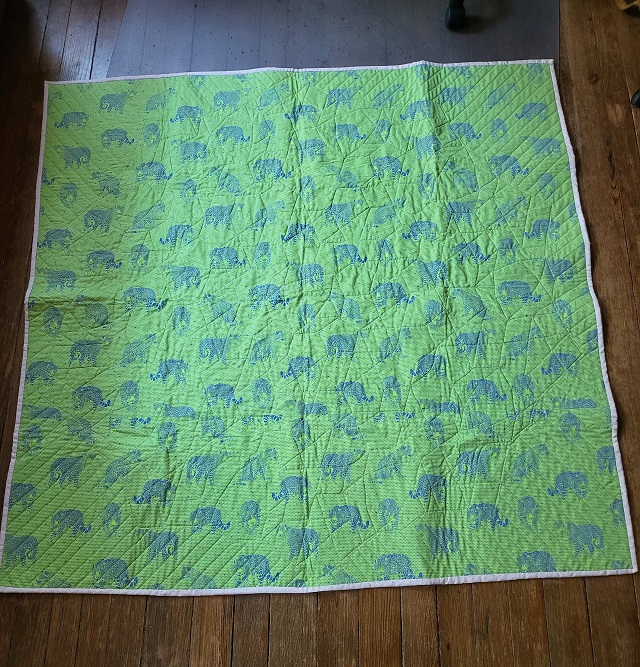 | This quilt is all English Paper Pieces and appliqued on a background. The pattern and material are from Tula Pink who is a graphic designer with Free Spirit. She uses a lot of color and quite often animals can be found in her designs for fabric. | ||||