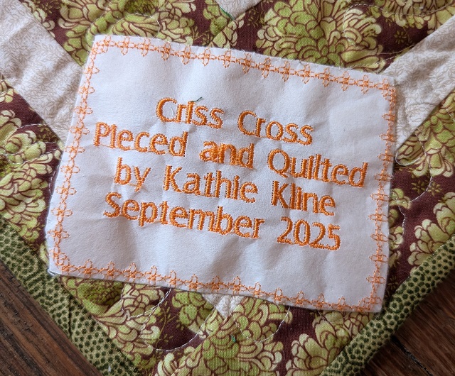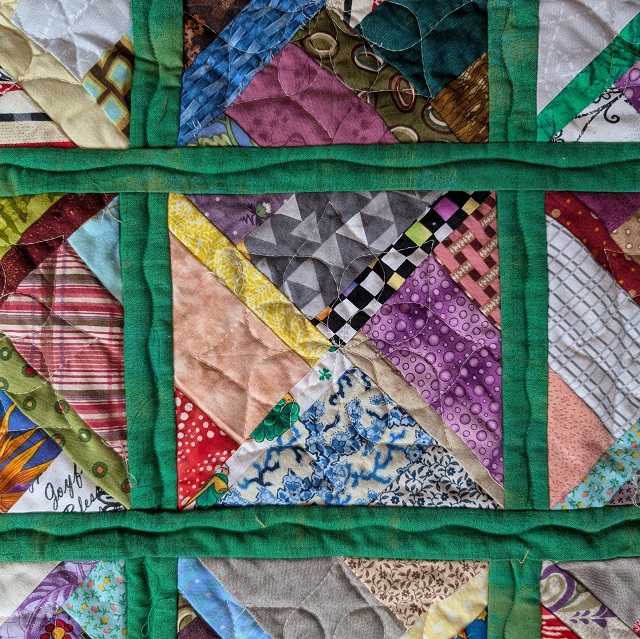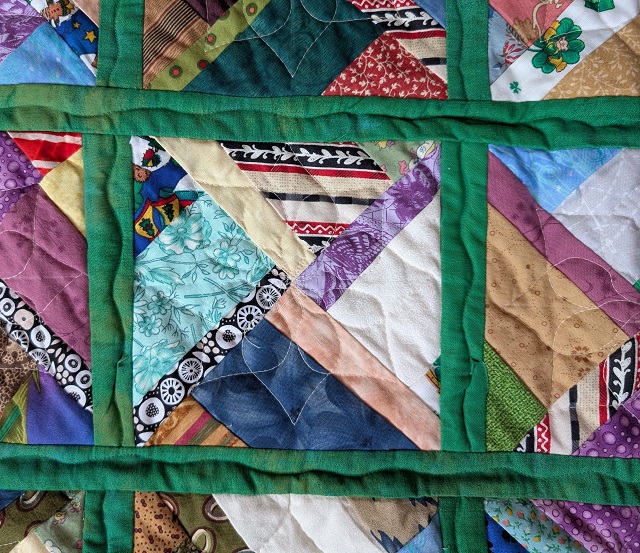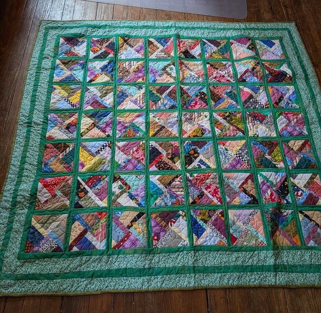| This quilt is made with 2.5 inch left over strips. The strips are sew togeth then cut from corner to corner both directions. The bocks are then put together from 4 different squares. Fun project to make and a good way to use up scraps. | ||||