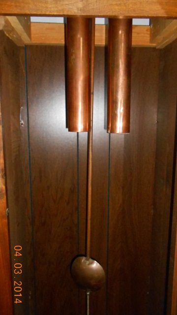 John Hardie, Kathie's third Great-Grandfather, brought this family clock from Scotland, receiving a land patent from King William IV in 1837. It has a hand painted face depicting dress of the British Isles from that era. The original case was destroyed by mildew in the hold of the ship on his trip to Canada from Scotland. At some point a second case was made of birch, but in later generations it was destroyed by a fire. Orlin Border, Kathie's father, brought the box of parts home, rebuilt the clock and built the case from cherry wood. The smoke damage from the fire is still visible on the face. Orlin was a plumber by trade so he used parts readily available to reconstruct the works of the clock. The weights are made from lead filled copper water pipe and the pendulum was created from a float from a steam boiler. Orlin also loved his black powder rifles, so the pendulum weight is filled with shot for balancing.