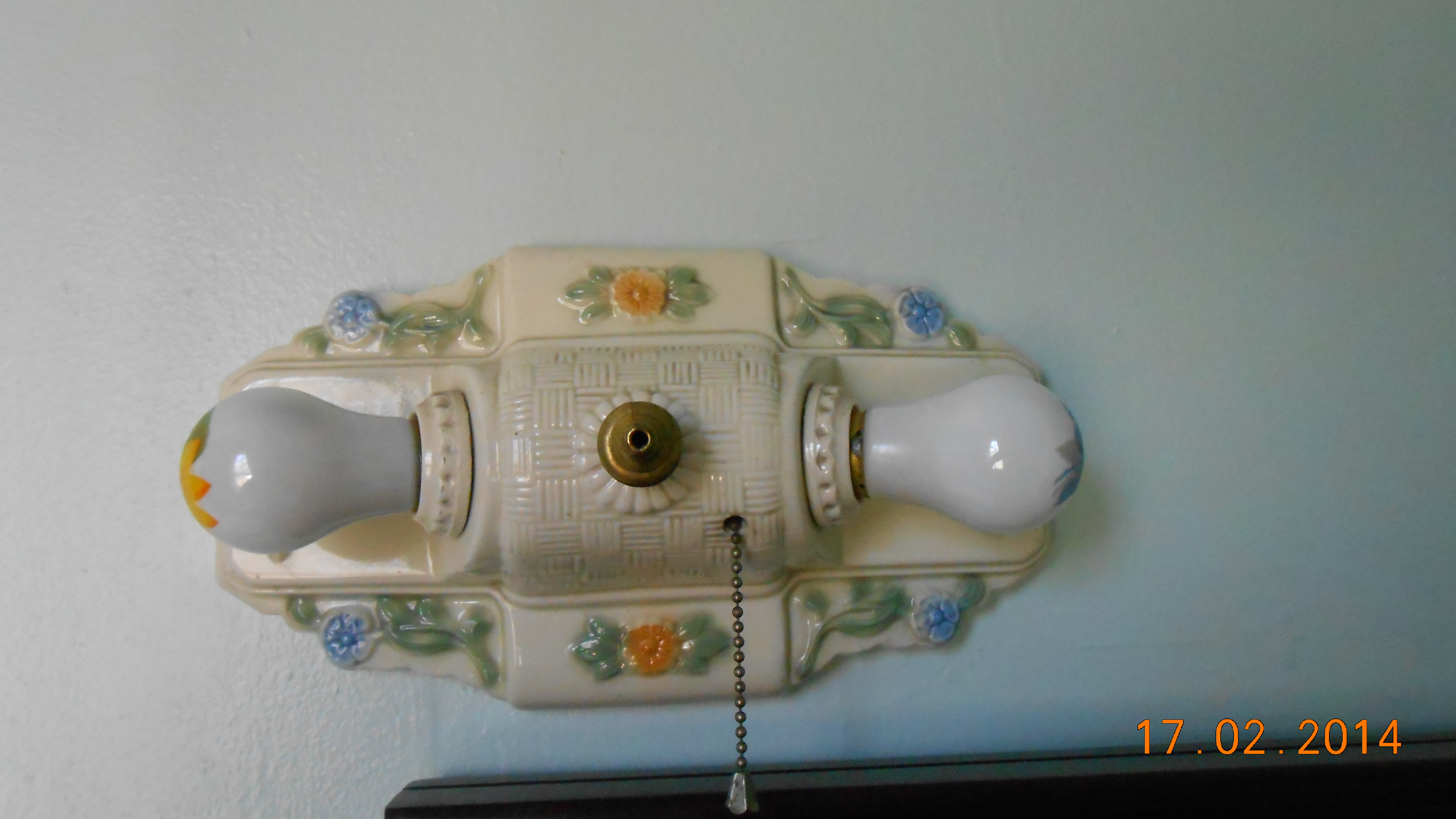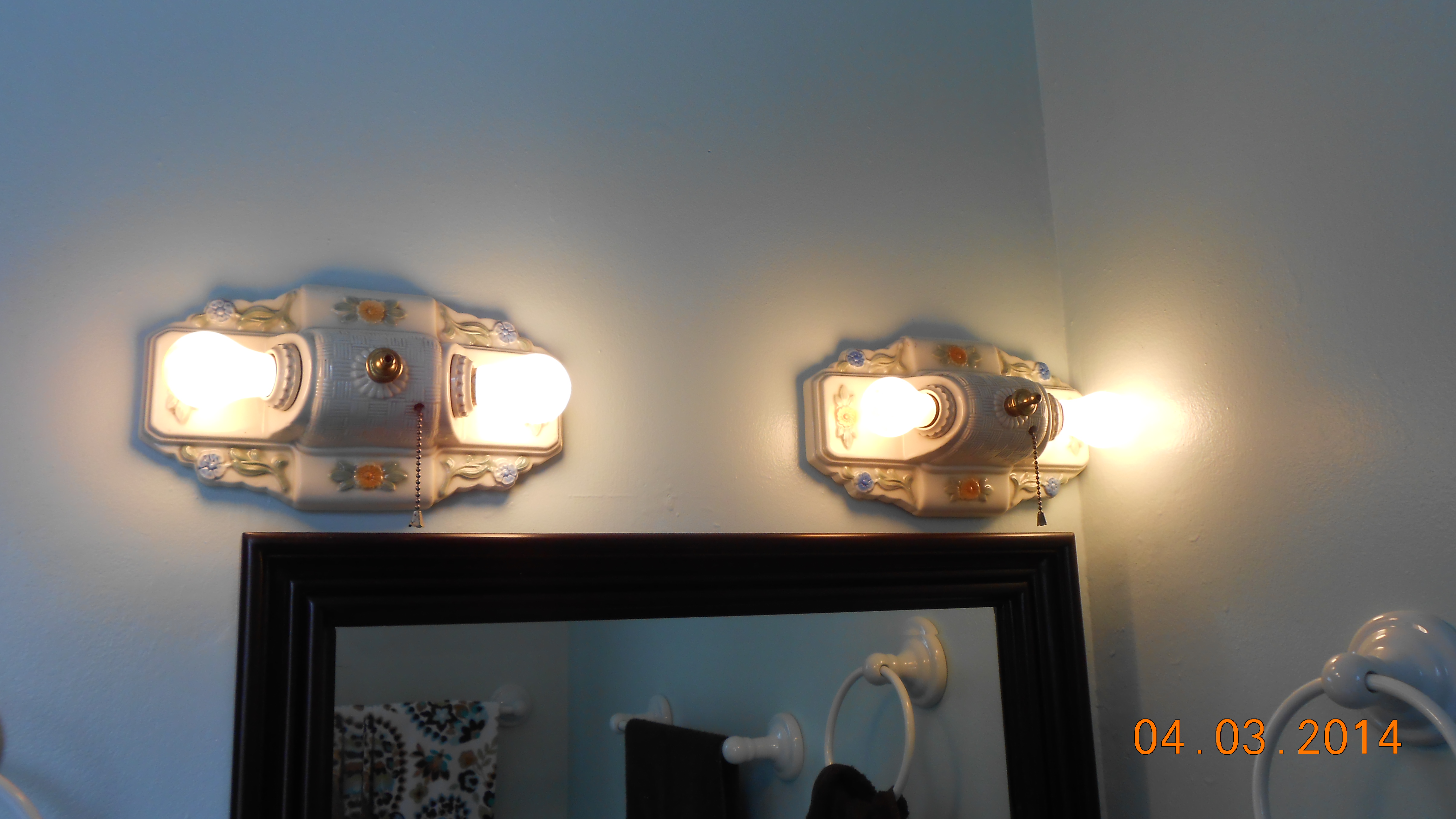 | This set of two wall lights belonged to Al Verlautz and Ester Zaiser Verlautz, Jim's grandparents. Jim's parents also used them in the hallway of their Cascade, Idaho, house. They now light up the lavatory of the spare bathroom in our Smithfield house. | ||||