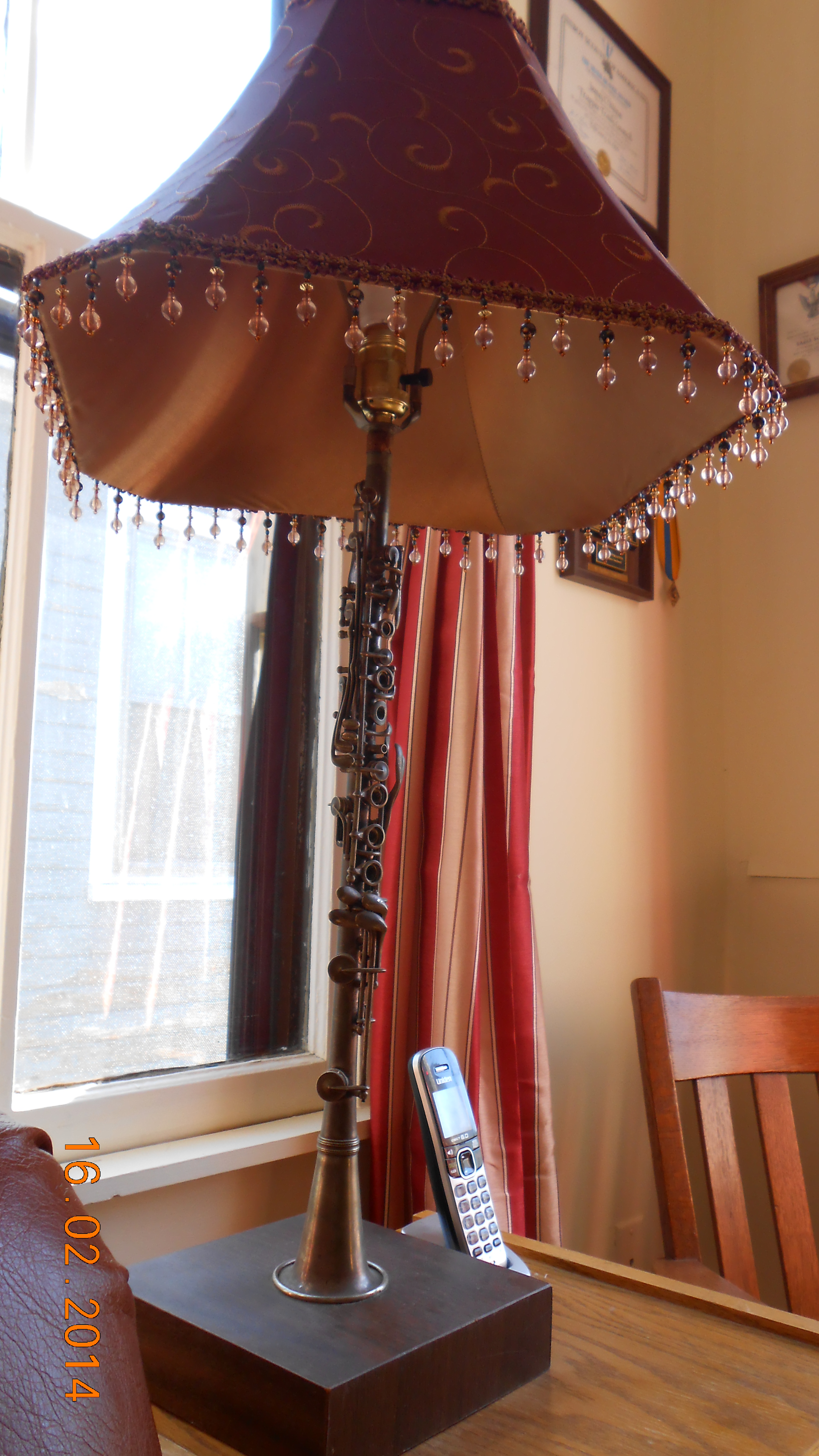 | While attending college in Chicago, Illinois, Jim worked for a music store creating lamps from musical instruments for them to sell. This clarinet lamp Jim built for himself is the only musical instrument lamp we kept. | ||||