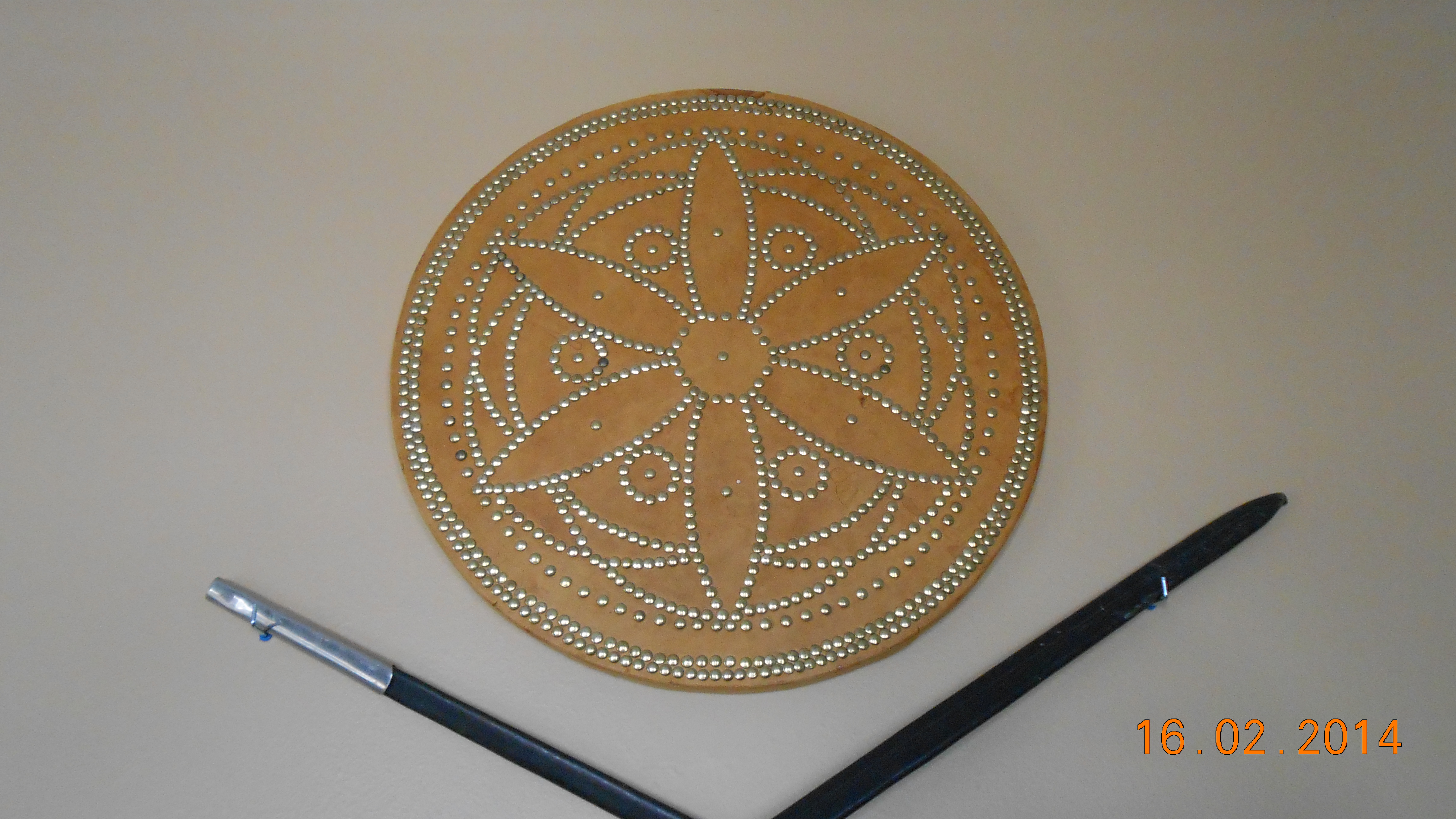 | For years Kathie and her dad, Orlin Border, were active in the Royal Highlanders Bagpipe Band located in the Treasure Valley of Idaho. During that time, Orlin hand built this Scottish targe. | ||||
