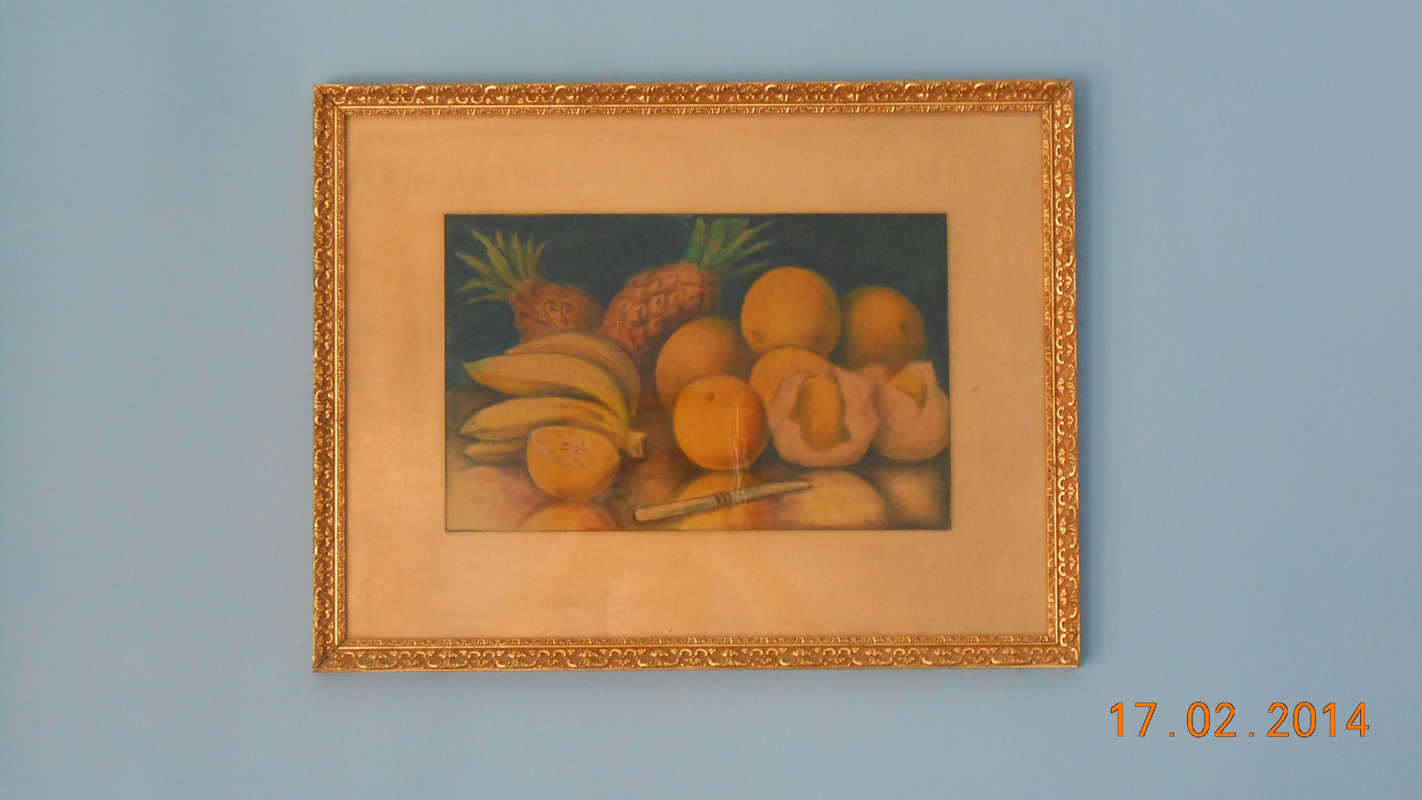 | This still life was painted by Carolyn Johnson Gardiner (Kathie's second Great-grandmother) sometime after she arrived in Canada from Ireland. She did not start painting until her later years. It was framed and hanging in the home of Lillian Gardiner Hardy (Kathie's Grandmother) as long as Kathie can remember. | ||||