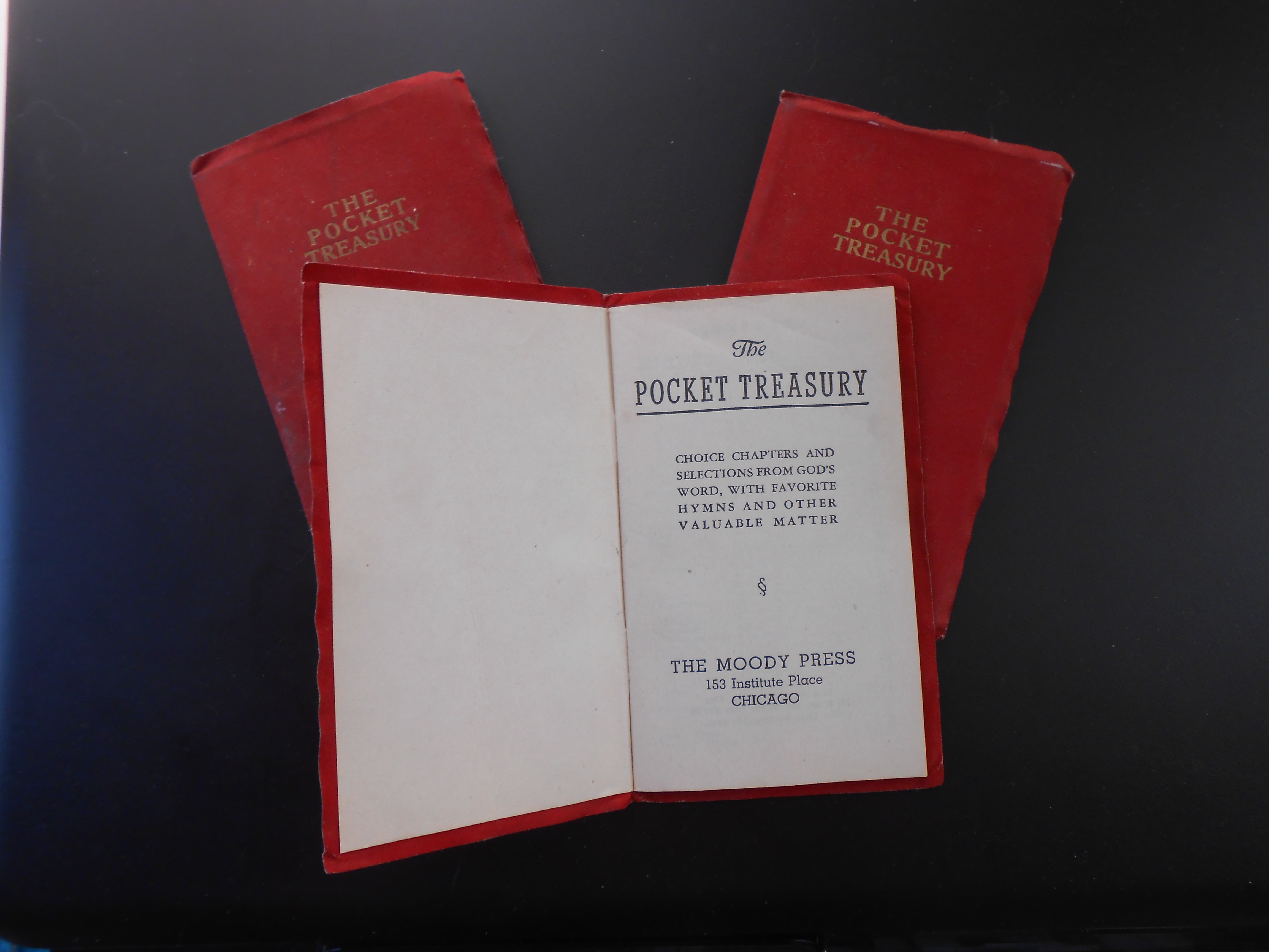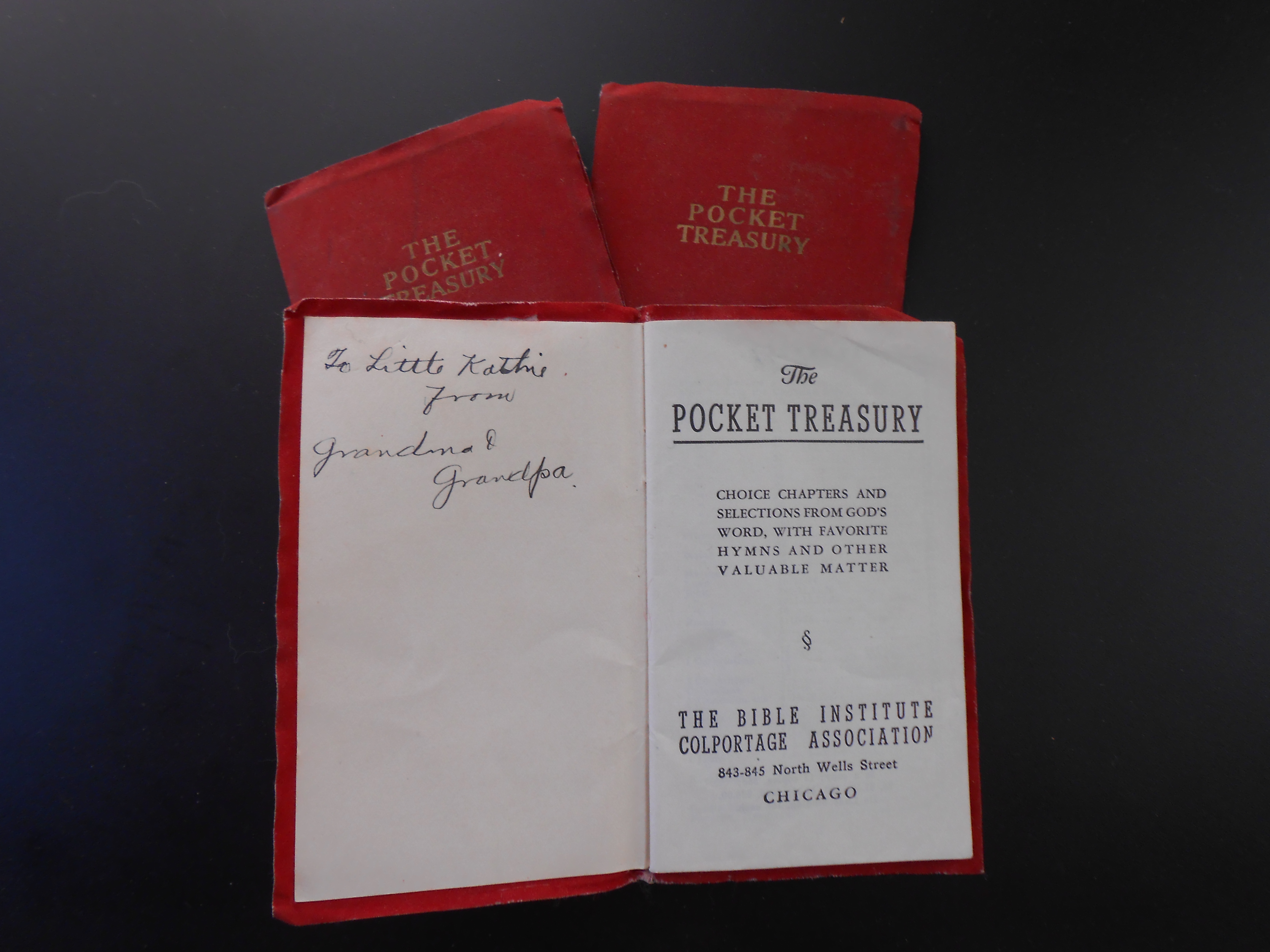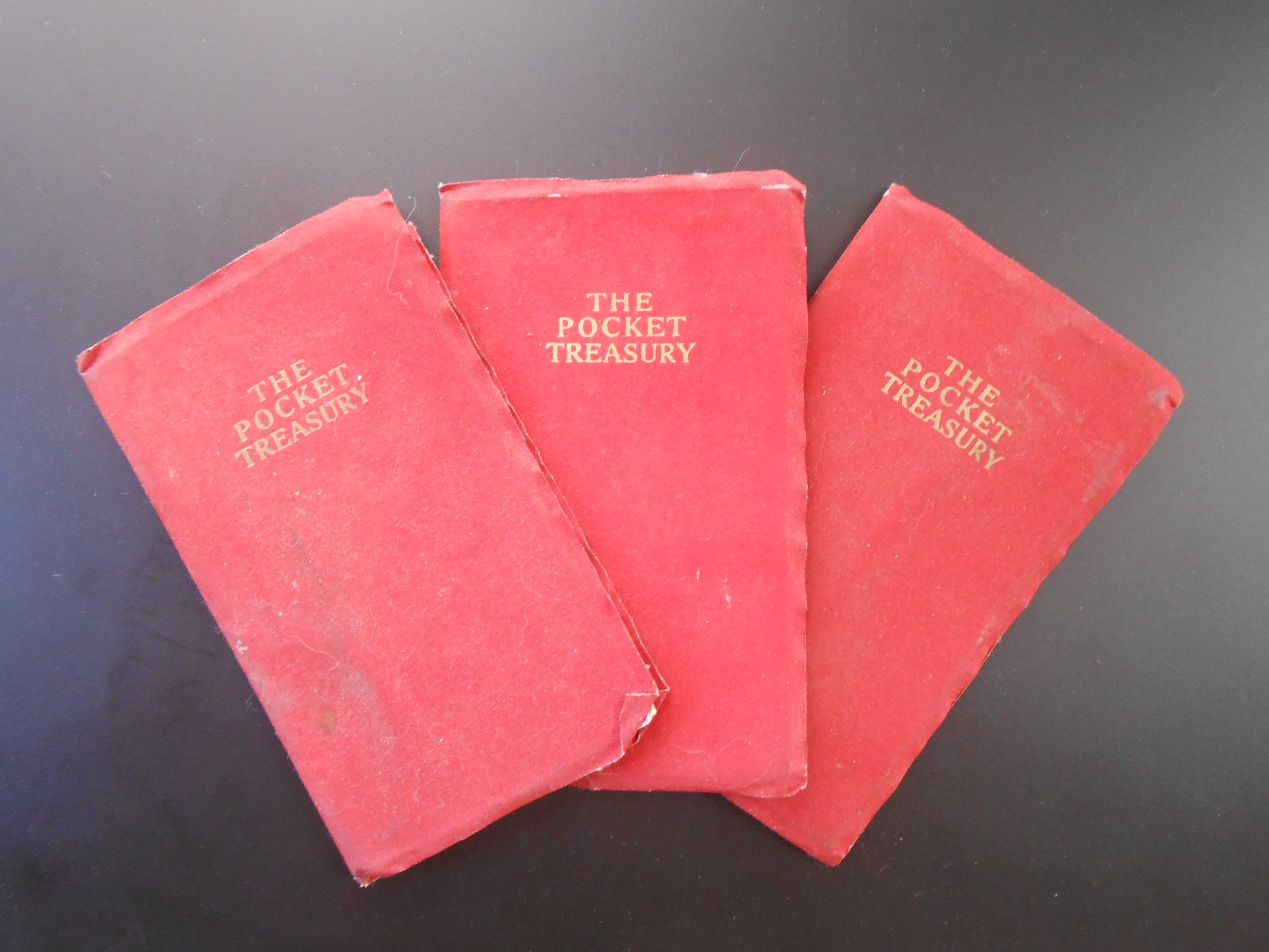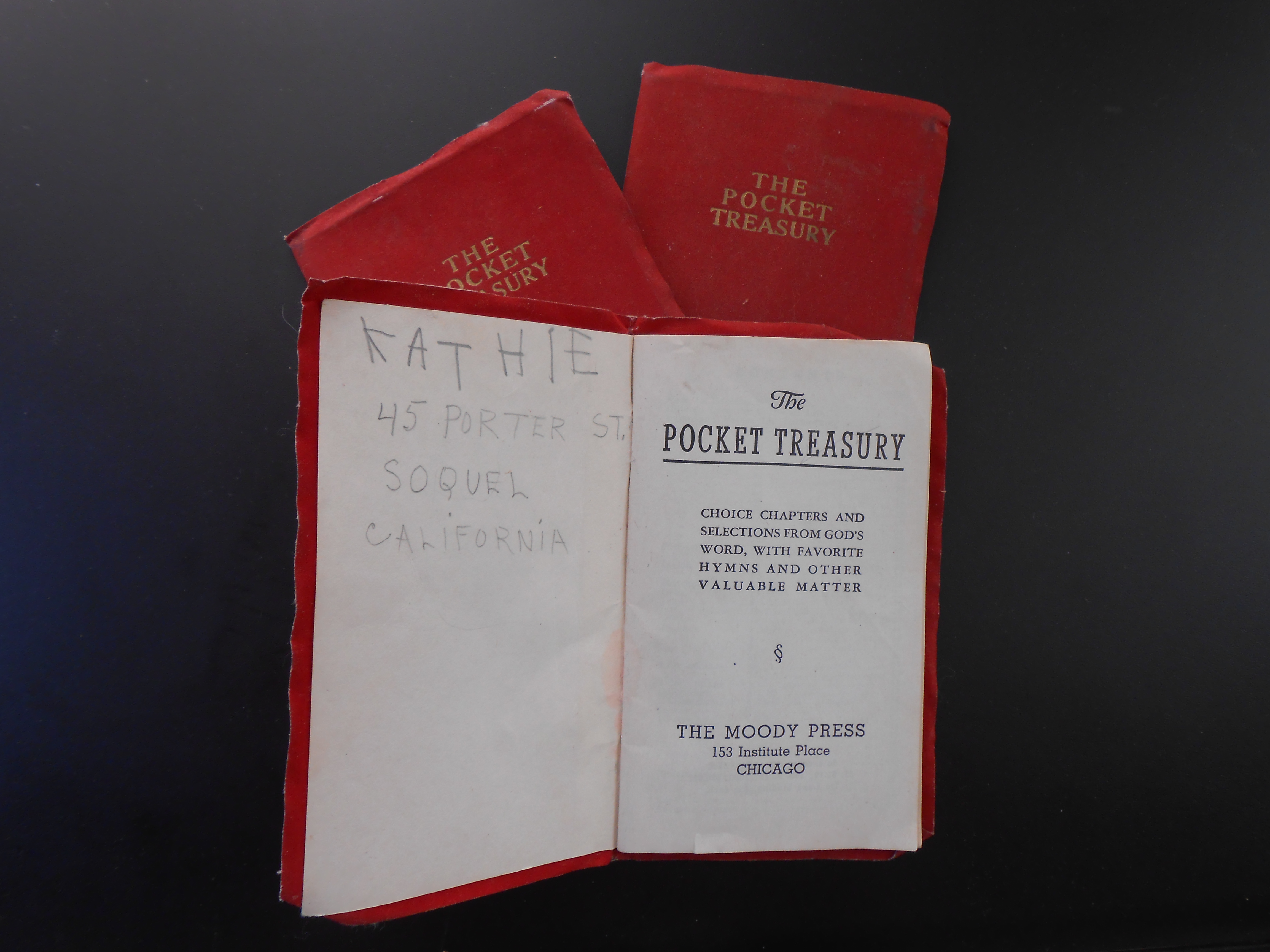 | This set of three books called "The Pocket Treasury" was given to Kathie by Clarence Border & Mary Salsbury Park Border (her Grandparents) while she was a child living in Soquel, California. The books contain bible passages and motivational material. | ||||