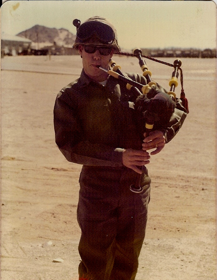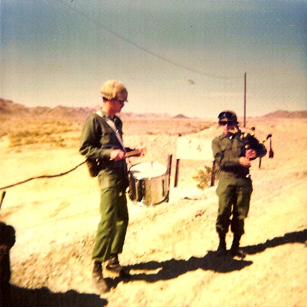 | Jim and drummer Ron would pipe from the front of the formation to lead the Battalion off the base and back on to the base for the regular 10 mile marches. This is a picture of them entertaining while out on manuevers. | ||||